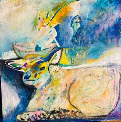 Tittar på målningen och den tittar tillbaka. På riktigt så kan tavlor det. Ni ser ju själv. Renen stirrar rakt ut ur färgerna, nästan mänskligt. Fast den ser inte helt ut som en riktig ren. Men iaf en fantasiren i ett hopkok av färger. Å det borde bli rörigt. Men istället blir det... ändå levande på nåt sätt.