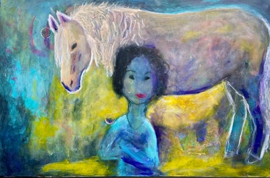 Jag ser en människa i blått och bakom henne står en häst, ljus och stilla.